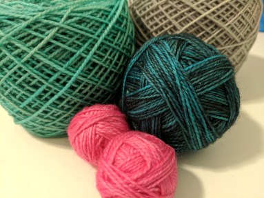I’m still waffling on color choices, but as I’ve learned from quilt making, it really doesn’t matter, since things end up looking pretty good in the end. Hopefully these turn out better than the last pair and I will actually feel confident enough to share a photo. I’m thinking I’ll use the Madelinetosh Tosh Sock in Astrid Gray as the main color, and either Esoteric (the dark teal) and Hosta Blue (the light teal) with a splash of Pop Rocks (the pink) or the Astrid Gray with Ink (the dark blue) and Liquid Gold. I’ll go with the first option if it is a more feminine pattern and the second option if it’s a more masculine pattern.