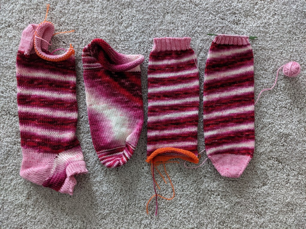 Anyway, after fiddling with trying to make the heels and toes on the CSM, I finally called it and am in the process of hand knitting the heels, toes, and cuffs. Both heels and cuffs are done and are just waiting on the heels.