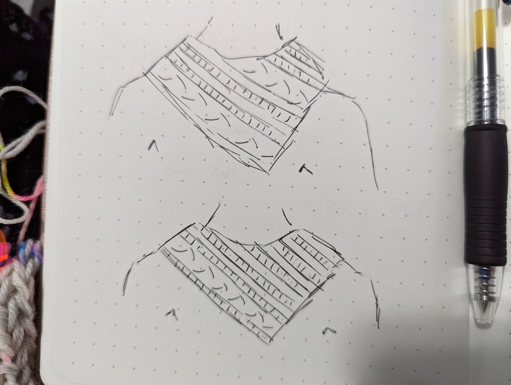 Now, as I approached the length that I wanted the neckline to be, I started to think about how I wanted to finish off the live edge. I considered a simple i-cord bind off, and while I think that would have looked really nice, I decided to try something crazy and attempt an applied edging, where you knit an edging perpendicular to the body of the fabric. The idea was that I’d try to make the cables meet at the corner, but if I couldn’t make it work out, I’d just overlap them and call it a day. Usually I don’t put a lot of pressure on myself to just finish and prefer to figure it out, but I was on a relatively short deadline for the cowl KAL that I wanted to submit the project for. After several hours on the floor with a notebook, a calculator, and a measuring tape (which my children call “measuring snakes”), I ended up with a tentative plan.