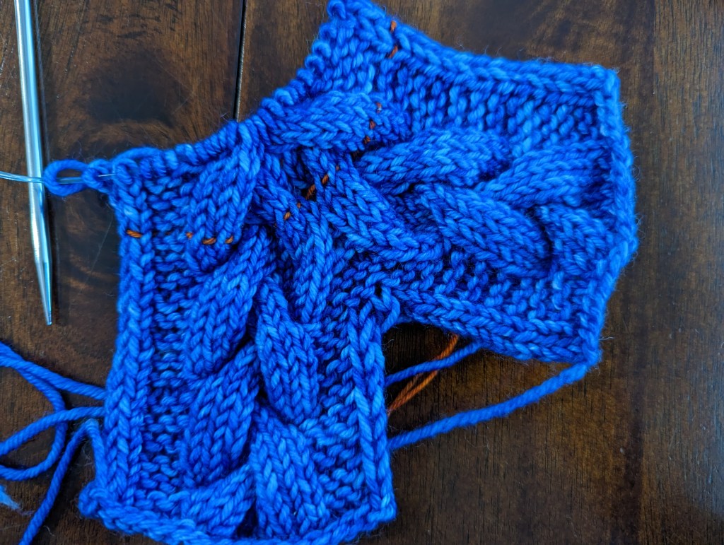 I did not get the corner right on the first try. I got down to where I was ready to start intertwining the cables and started taking very meticulous notes. After the first attempt failed, I realized I needed to switch to a swatch so that I wouldn’t wear out the yarn with multiple frogging and reknitting attempts. I am a problem solver, though, and I just knew that I could solve this problem if I stuck with it. It took me about three tries to get it right, and let me tell you, I was just over the moon with pride at how clever I was when I did.