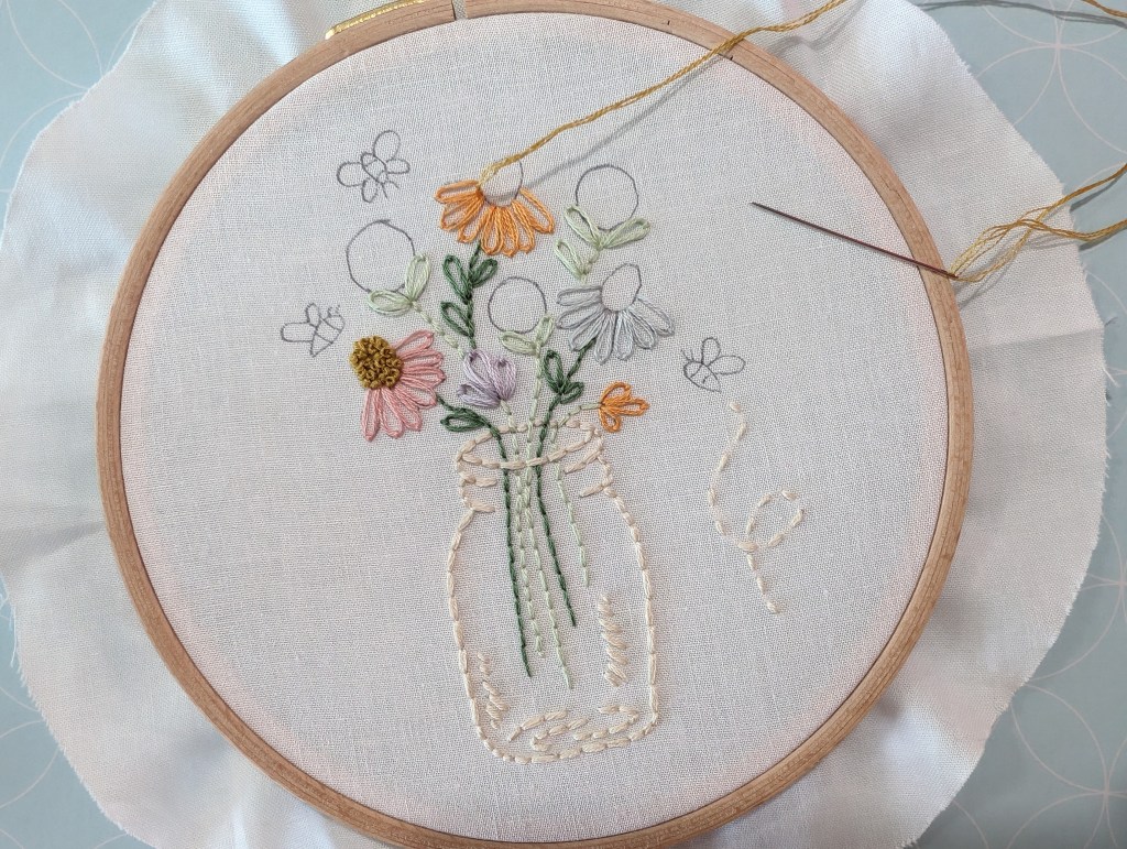 I started “Bee Happy” on March 13, 2024 and finished it on March 15, 2024. I did not make any modifications to the pattern. One of the things I am loving about my embroidery experience is how quickly you can see progress in your project. With knitting, sometimes I can work on a project for hours and only see minimal progress. Embroidery keeps my mind from wandering because I need to pay attention to each stitch, whereas with my knitting, I can almost do it in my sleep, and sometimes my mind is all over the place.