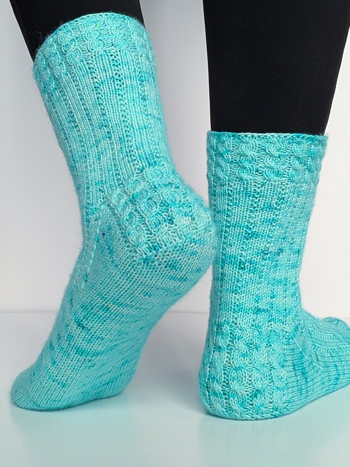 So, I promised her a design with a fancy heel flap. And here we are! The Alexander Socks, named for my friend Jordan, are for those of us Hamilton fans who will never be satisfied with vanilla socks and want to elevate our socks without a huge commitment to fixing missed cable crosses or having to focus, focus, focus. When incorporating these cables, I used what has become my signature increases and decreases at the starts and ends of the cables so that you don’t have to think too hard about which size to make — just use your vanilla stitch count, and you are good to go. I used Teal Torch Knits TTK Sock in the colorway Tall Drink of Water for my sample, and I love how these light speckles look with the cables.