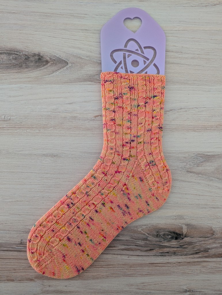 Personally, I think it looks fantastic! This gorgeous peach colorway is from The Lemonade Shop, and Heather is so talented at getting these teeny tiny individual rainbow speckles onto her skeins. Please forgive that there’s only one sock so far — the other one was the one I used for filming, and it just needs to be finished up, and then I’ll be wearing them all the time!
