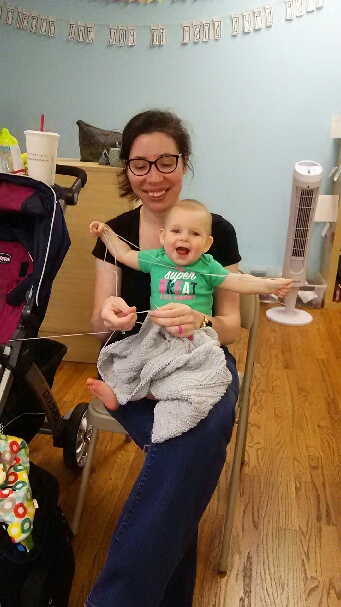 Also, my daughter is almost walking. She has an elephant toy that she walks behind as she pushes it around the house. Knitting time has definitely decreased now that she is mobile. I can knit about three stitches before she gets to the fireplace and tries to open the glass panels (after she crawls over to it, turns around to look at me, shakes her head “no” with a big grin, then turns back to the fireplace). SHE IS SO FAST. And AMAZING. I marvel every day at how awesome she is. Also, she likes to help me knit. 😀